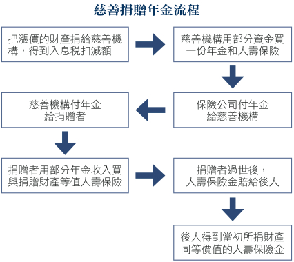 慈善年金其基本流程是捐贈人與一個慈善機構如教會等訂立一個合約, 捐贈人把財產捐給慈善機構,慈善機構答應提供一定數額的年金給捐贈人, 捐贈人就不用一次性的檄交資本增值稅而是拫據年金收入分次繳交, 這樣捐贈人的稅率就會減低從而省下大額增值稅。並且立即有大額的所得稅扣 減額可減去所得稅。慈善機構收到財產後賣掉, 一部分款項找一家好的保險公司買一份的年金付給捐贈人。餘下的作慈善用途。